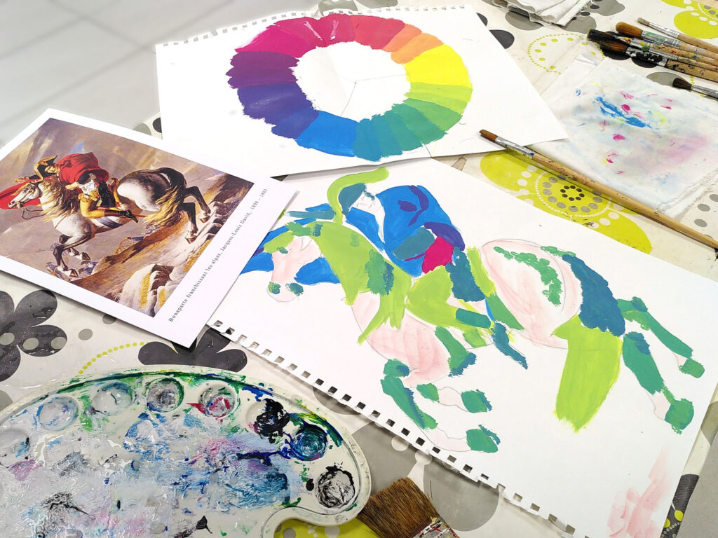 En atelier découverte de la peinture nous avons soufflé le chaud et le froid en explorant les températures de couleur. La touche de magenta dans l’interprétation froide de Bonaparte franchissant les Alpes, attire tout de suite l’œil. Voila qui illustre parfaitement le contraste de température.